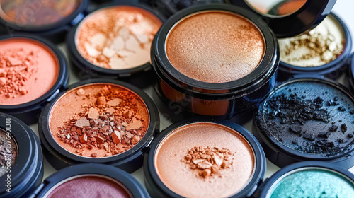 Naklejka premium Colorful makeup powders arranged in circular containers showcasing vibrant...