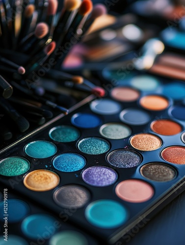 © Sergiy, Naklejka premium Colorful makeup table with diverse products showcasing artistry and beauty routines