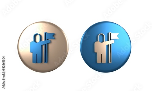 © Kostiantyn, Obraz premium Colorful Man holding flag icon isolated on white background. Victory, winning and conquer adversity concept. Circle button. 3D render illustration