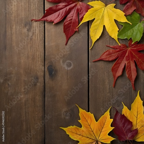© Khairun, Obraz premium Colorful maple leaves on wooden background.