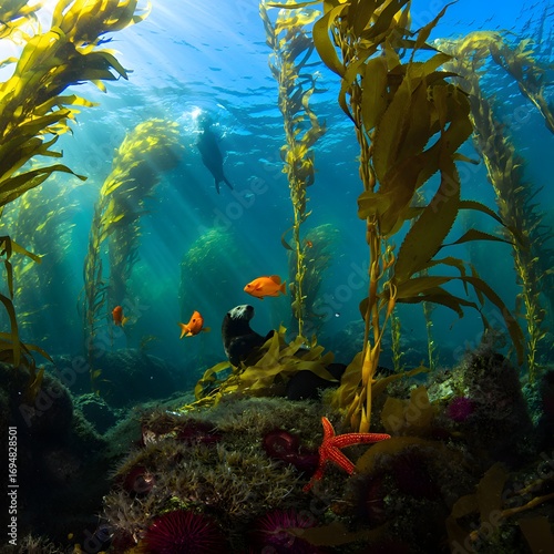 © Mahannan, Naklejka premium Colorful marine life flourishes among a vibrant tropical coral reef in the deep blue ocean