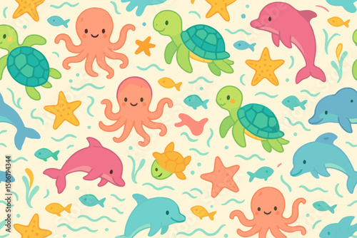 Fototapeta premium Colorful marine life pattern featuring playful dolphins, turtles, and octopuses in a whimsical underwater design