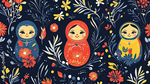 Obraz premium Colorful Matryoshka Dolls Amidst Vibrant Floral Designs