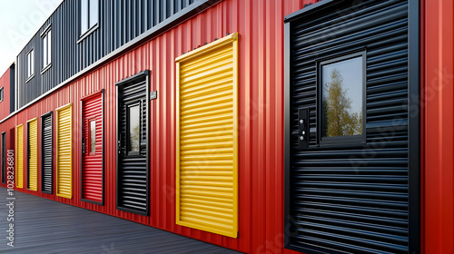Fototapeta premium Colorful Metal Doors on a Red and Black Building.