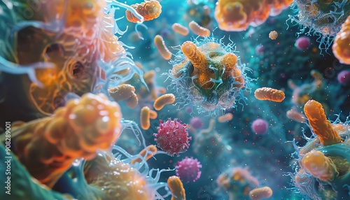 Fototapeta premium Colorful microscopic view of microorganisms and bacteria, highlighting the...