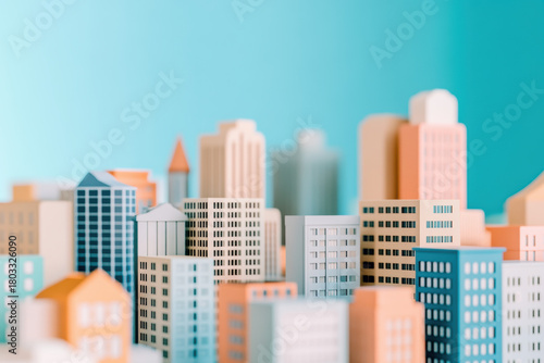 © Aleksandra, Obraz premium Colorful Miniature Cityscape with Modern Architecture Against Blue Skyline