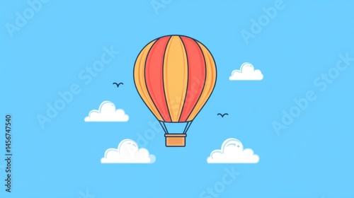 Fototapeta premium Colorful minimalistic hot air balloon art drawing in bright blue sky with...