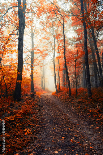 Fototapeta premium colorful misty forest in autumn time