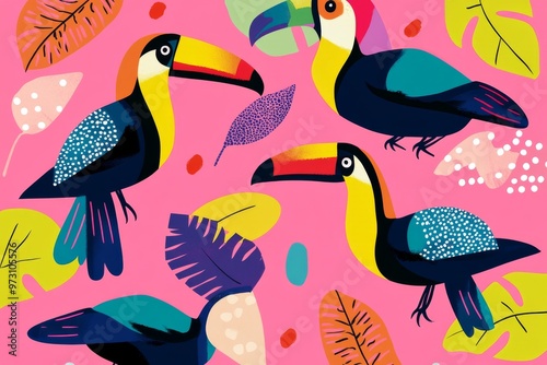 Naklejka premium Colorful modern abstract painting of two toucans with vibrant patterns and...