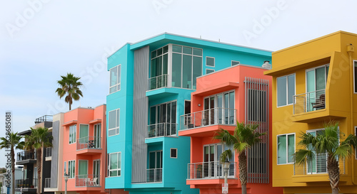 Naklejka premium Colorful modern beach houses row with blue, coral and yellow exteriors and palm trees