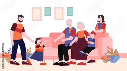 Obraz premium Colorful modern family gathering illustration vector. Father mother son daughter grandpa grandma