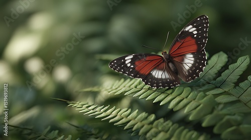 © ChaokuayOfficial, Fototapeta premium Colorful Monarch Butterfly Resting on Green Fern Leaves in a Tranquil Natural Setting, Macro Photography