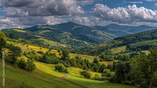 © Harsa, Fototapeta premium Colorful Mountain Valley Landscape With Lush Greenery And Hills
