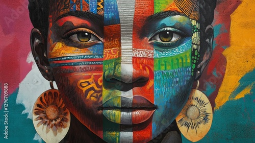 Fototapeta premium Colorful mural of a woman with artistic face paint and earrings, set against...