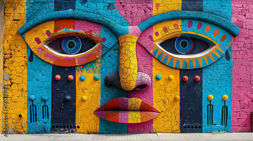 Naklejka premium Colorful mural of abstract face, vibrant street art, reflects urban...