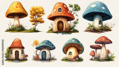 Fototapeta premium Colorful mushroom-shaped fairy houses surrounded by natural scenery isolated...