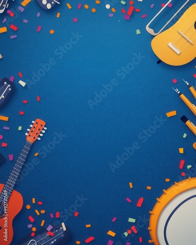 Obraz premium Colorful musical instruments and confetti create a vibrant backdrop for any...