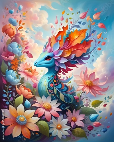 Obraz premium Colorful mythical creature amidst vibrant flowers in a whimsical garden setting