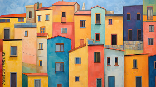 Fototapeta premium Colorful naive art depicting vibrant houses in a quaint village during daytime