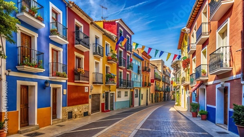 © DigitalArt Max, Fototapeta premium Colorful narrow street in villajoyosa, spain, features vibrant multi-hued houses, la vila joiosa municipality building, and provincial flags, under a serene blue sky.