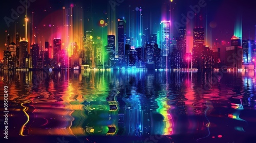 Obraz premium Colorful neon city skyline reflecting on the water at night, creating a...