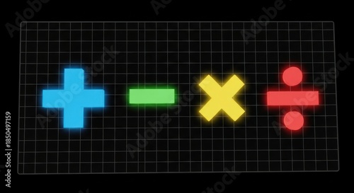 Obraz premium Colorful neon mathematical symbols on a grid background emphasizing basic arithmetic operations