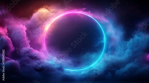 © GenerativeAIpicture, Obraz premium Colorful Neon Ring Glowing Inside Stormy Clouds in 3D Render
