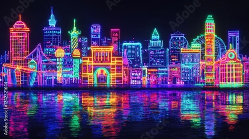 Obraz premium Colorful Neon Skyline with Reflections at Night Over Water in a Vibrant Urban...