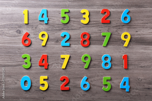 © New Africa, Fototapeta premium Colorful numbers on wooden school desk, flat lay