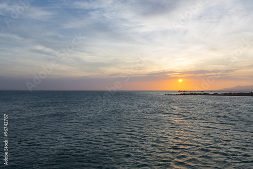 Naklejka premium Colorful ocean beach sunset with deep blue sky and sun rays on the harbor of...