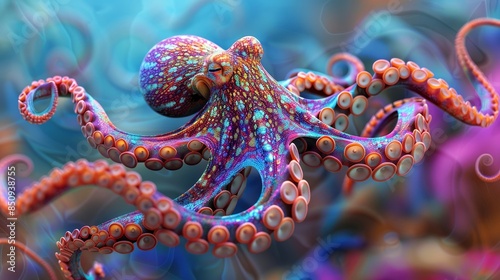 © Putra, Obraz premium Colorful Octopus in Vibrant Underwater Scene with Intricate Patterns