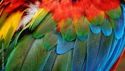 © Jessi, Fototapeta premium Colorful Of Bird S Feathers Exotic Nature Background And Texture Macaw Feathers