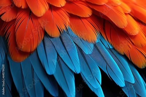 Obraz premium Colorful of Scarlet macaw bird's feathers with red yellow orange and blue shades, exotic nature background and texture