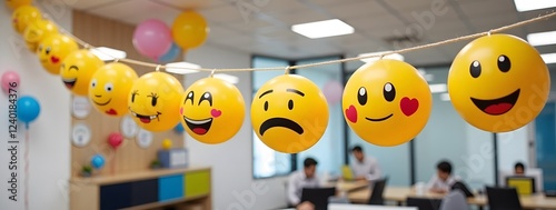 Obraz premium Colorful office decorations with emoji balloons and professional atmosphere