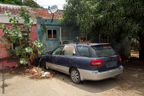 © Lucia, Fototapeta premium Colorful old building in colonial style and junked car in narrow street with palm trees in Oranjestad in Aruba during spring time.