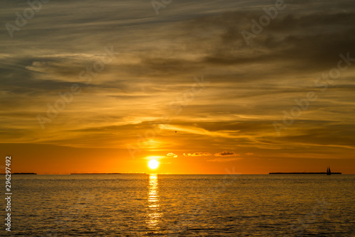 © Iaroslav, Fototapeta premium Colorful orange beautiful sunset on sea summer background. Hot and romantic sunset over the ocean. Calm landscape.