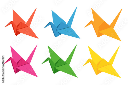 © ArtNeuroNet, Fototapeta premium Colorful origami cranes in six vibrant colors on white background folded origami cranes
