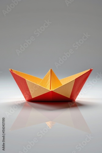 © Mongkol, Fototapeta premium Colorful Origami Paper Boat on Smooth Surface with Reflection in Studio Lighting