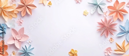 © Nijat, Naklejka premium Colorful origami spring flowers in soft peach, blue, and white arranged artfully on a light white background creating a vibrant floral frame