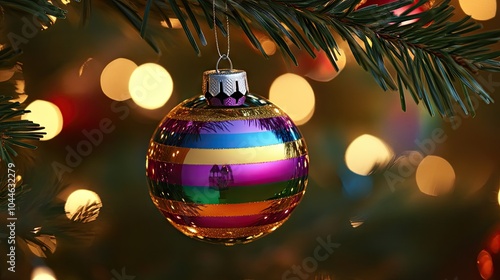 Fototapeta premium Colorful Ornament Hanging from Christmas Tree Branch