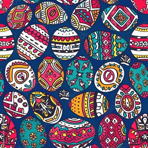 © Nuansaart, Fototapeta premium Colorful Ornamental Easter Eggs on a Blue Background