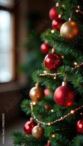 © Temteen, Fototapeta premium colorful ornaments and garland on a wooden Christmas tree, holiday cheer, ribbons, bows