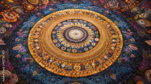 Fototapeta premium Colorful, ornate mandala with a central golden disc, surrounded by intricate...