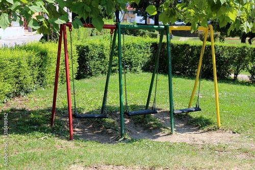Fototapeta premium Colorful outdoor public playground equipment metal swing with three plastic seats in shade of tall old tree surrounded with grass and hedge in local public park