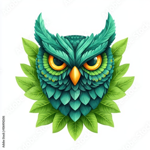 Fototapeta premium Colorful owl illustration with vibrant green feathers and eyes, surrounded by lush leaves, white isolate background.