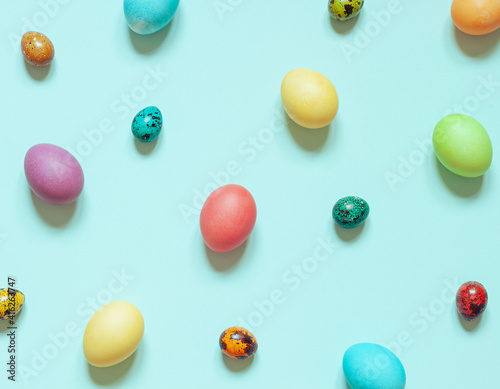 Fototapeta premium Colorful painted Easter eggs on the blue background. Top view
