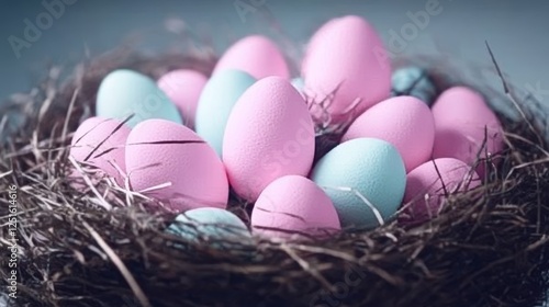 Obraz premium Colorful Painted Eggs in Straw Nest Celebrating Spring Holiday Season Easter...