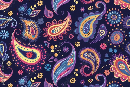 © Jeannaa, Obraz premium Colorful paisley pattern with floral elements on a dark background. Perfect for textiles, wallpaper, and design projects.