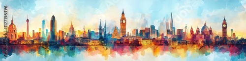 Fototapeta premium Colorful panoramic skyline painting of famous landmarks