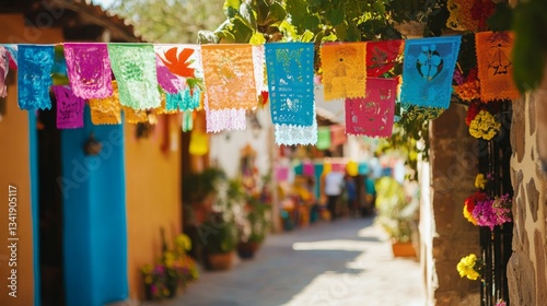Fototapeta premium Colorful Papel Picado Decorations Hanging Over A Charming Street In A Historic Village